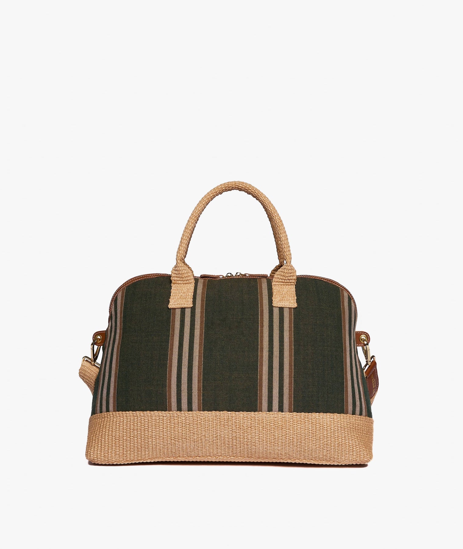 The London Smart Antibes Travel Duffle Bag in Myrtle Green expresses Mediterranean elegance in a deep, refined shade inspired by coastal greenery and the sunlit Riviera. The striped fabric in green, sand, and ivory creates a natural, sophisticated colour balance, while the woven straw-effect base and handles add a distinctive textured detail with timeless resort appeal.